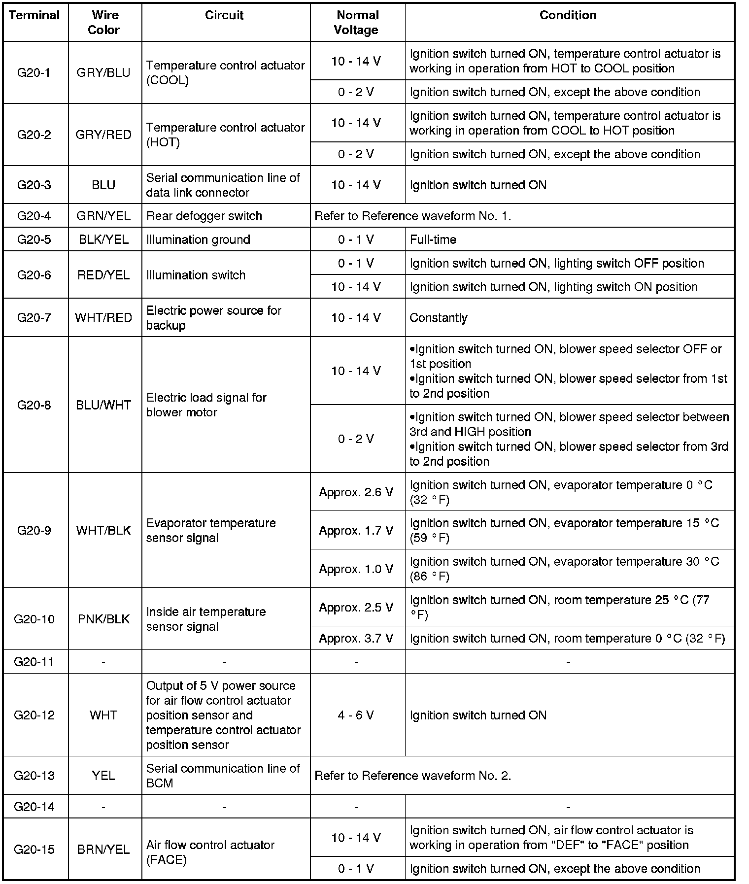 As each terminal voltage is affected by the battery voltage, confirm that the battery voltage is 11 V or more when ignition switch is ON.