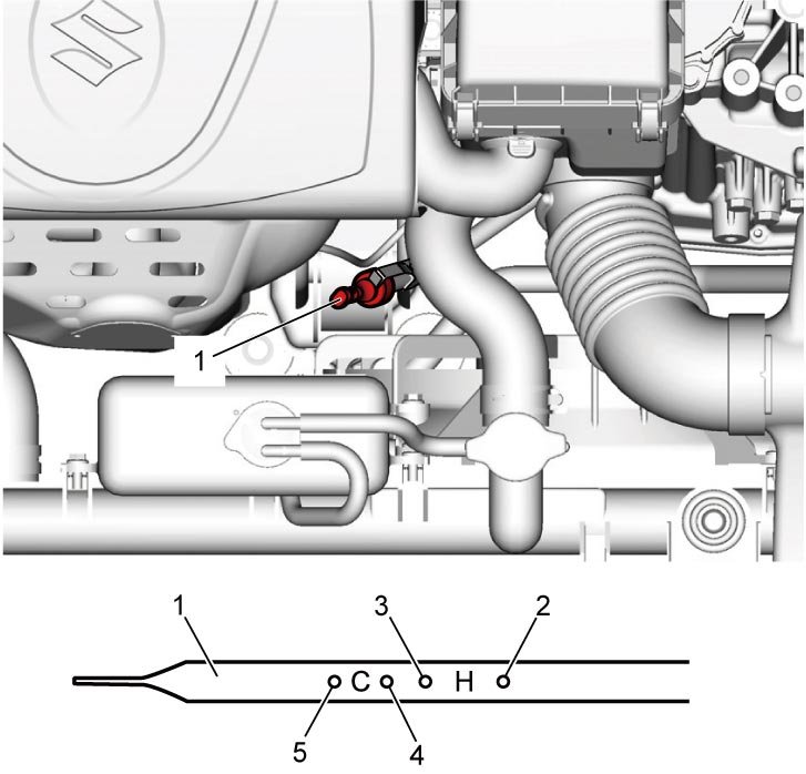 8) Pull out fluid level gauge (1) again and check CVT fluid level indicated on it. Lowest fluid level should be between full hot (2) and low hot (3). If it is below low hot, add specified CVT fluid up to full hot.