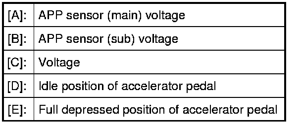 If sensor voltage is out of specified value or does not vary linearly as the following graph, check APP sensor assembly referring to Accelerator Pedal Position (APP) Sensor Assembly Inspection Accelerator Pedal Position (APP) Sensor Assembly Inspection.