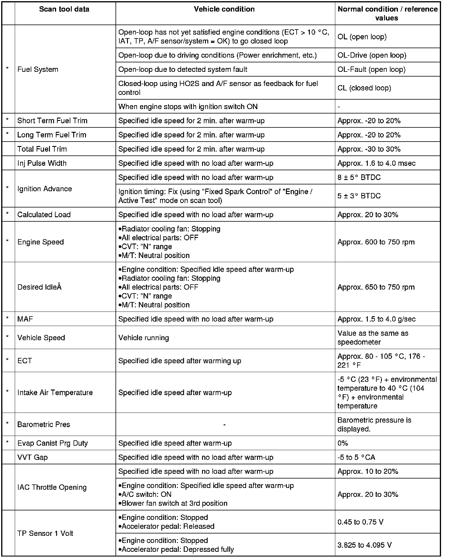 - With the generic scan tool, only star (*) marked data in the following table can be read.