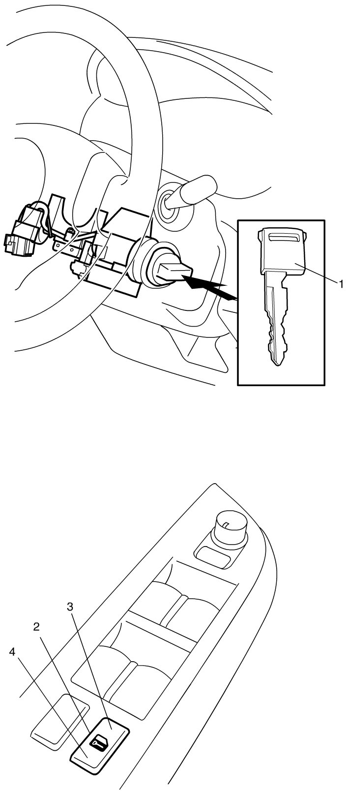 3) Insert ignition key (1) into ignition key cylinder.