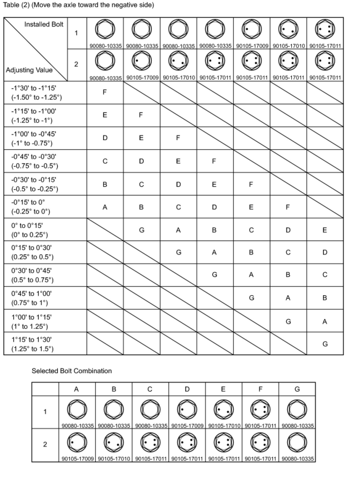 Check the combination of installed bolts. Select appropriate bolts from the table below to adjust the camber to the specified values.
