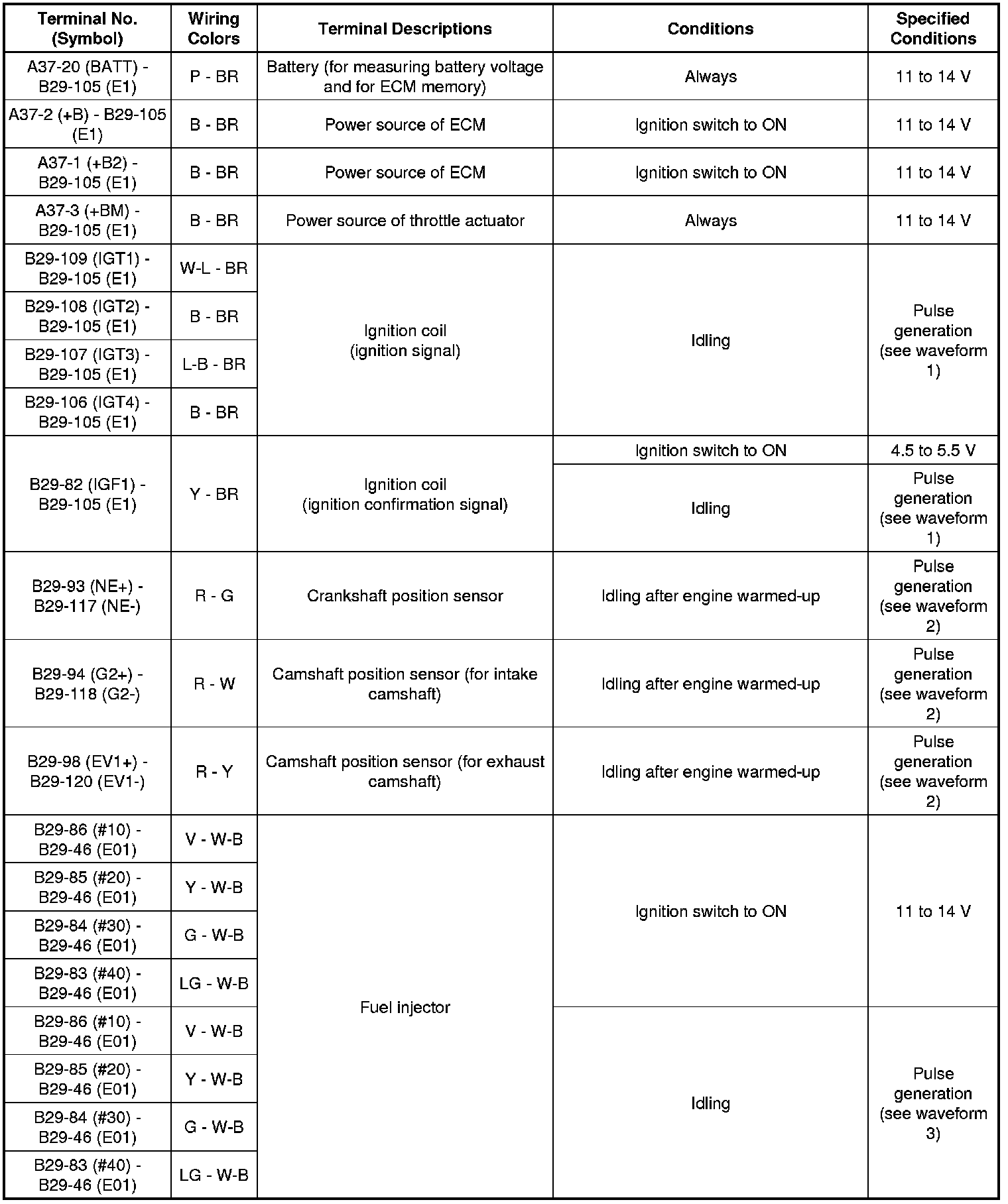 The standard normal voltage between each pair of the ECM terminals is shown in the table below. The appropriate conditions for checking each pair of the terminals are also indicated. The result of checks should be compared with the standard normal voltage for that pair of the terminals, and displayed in the "Specified Conditions" column. The illustration above can be used as a reference to identify the ECM terminal locations.