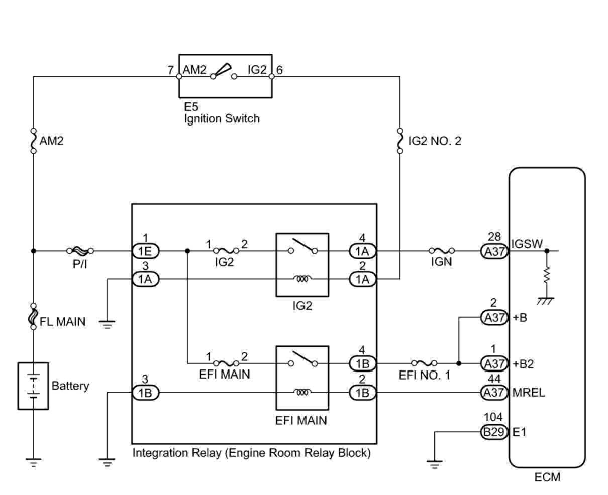 When the ignition switch is turned to ON, the battery voltage is applied to the IGSW terminal of the ECM. The output signal from the MREL terminal of the ECM causes a current to flow to the EFI MAIN relay coil, closing the EFI MAIN relay contacts and supplying power to terminals +B and +B2 of the ECM.