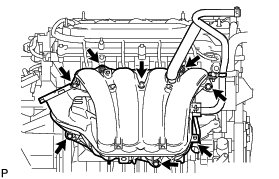 (b) Install the intake manifold with the 5 bolts and 2 nuts, and connect the wire harness clamp.