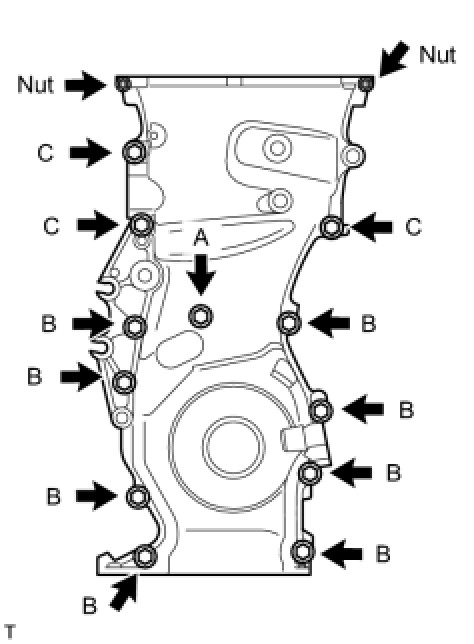 TIMING CHAIN OR BELT COVER SUB-ASSEMBLYTemporarily install the timing chain cover with the 12 bolts and 2 nuts.
