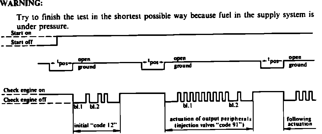 5. After approximately 2.5 seconds the check engine lamp will flash one of three codes as shown in Fig. 5. A code 91 for fuel injector test, a code 92 for idle regulator test or a code 94 for the tank emission valve or TEV test. Proper functioning of the item being tested will be indicated by a audible Tick-Tock sound.